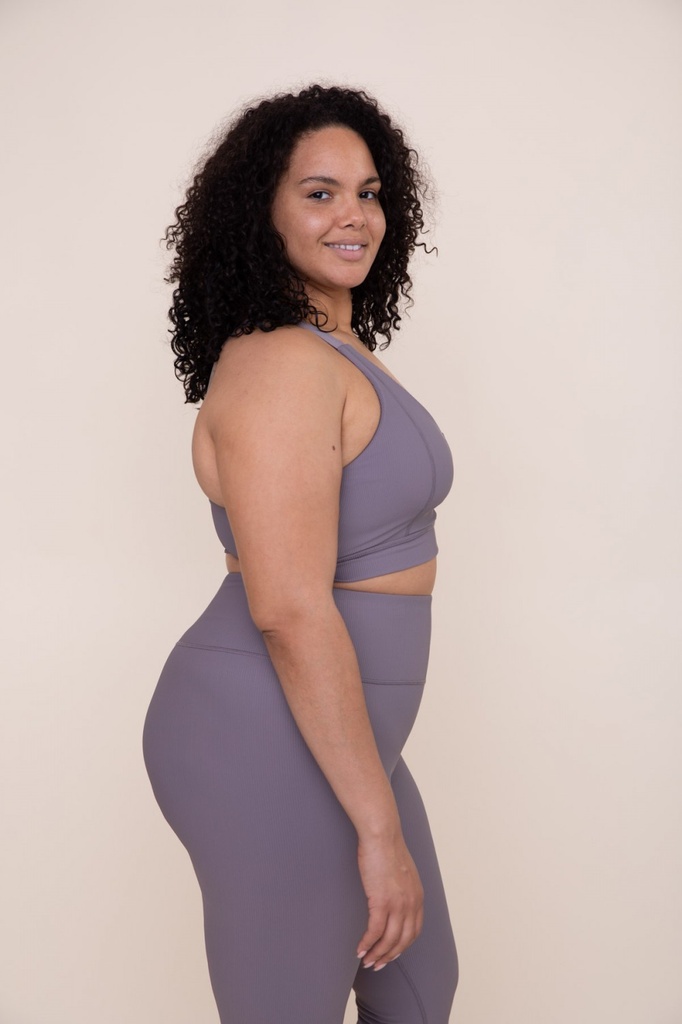 This performance-level sports bra was constructed using a micro-ribbed solid fabric. It features seam accents in the middle front and the sides for a sleek look and adjustable wide bra straps with O-ring.